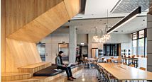The building form references the university’s original Winston masterplan through alignment and form. Two wings connect in a central entry atrium in which a sculptural timber stair links five levels of contemporary collaborative and teaching spaces.